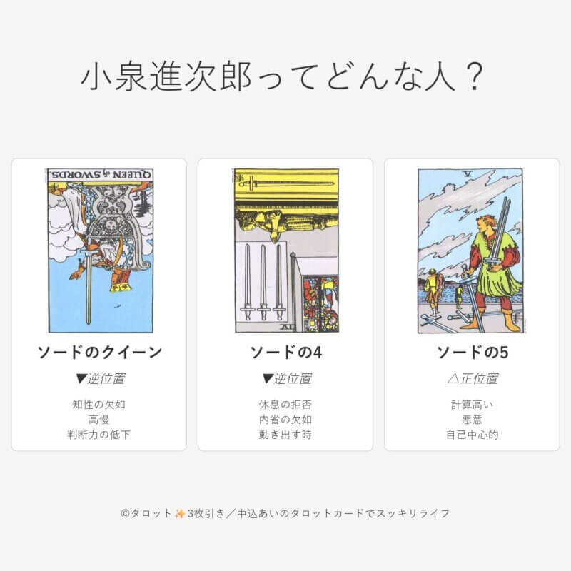 「ソードのクイーンの逆」→私はこのカードが出ると、仕事ができないのにできる風に見せている人、と読んでしまいます…。それか、進次郎さんの奥様とか、お母様とかから何かしらプレッシャーを受けてたりして…とか。