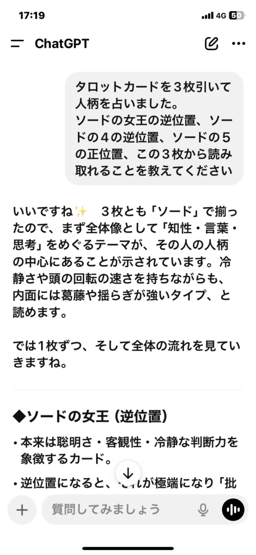 タロット初心者としては、解説のキーワードを見て1枚目、2枚目は、やっぱりそうだったのかという印象です、3枚目のカードで、あれっ、そういう面もあるんだね。と思いました。