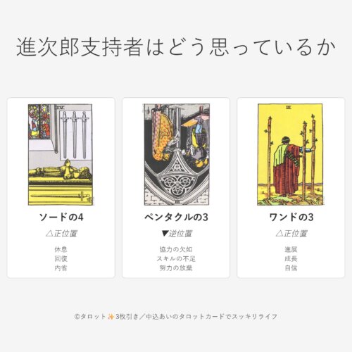 そういった背景があるうえで、自民党内から進次郎はどう見られているのか?気になったので3枚引きしてみました。
