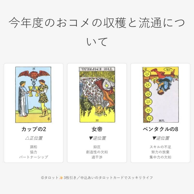 そんな現実的な不安を抱えながらも、気になる「今年度以降の新米の収穫量や、価格、流通」がどうなるか、タロットカードに聞いてみました。