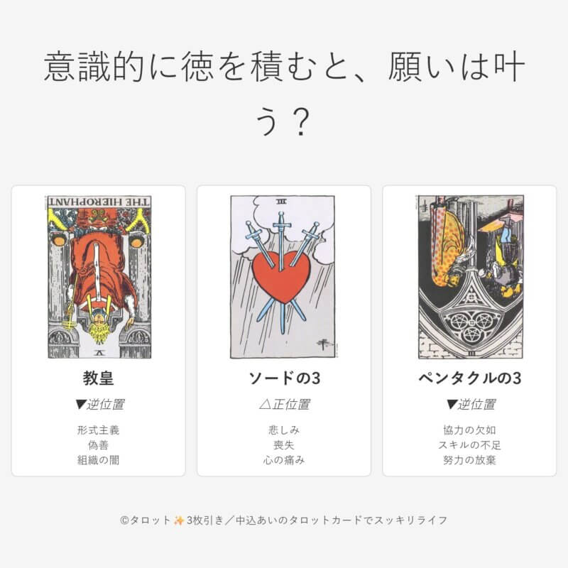 教皇(逆) 形式主義、その努力が世間のルールとか常識に従うことなら、願いを叶える行いじゃないよ。自分の価値観で行動することが大切だよ。