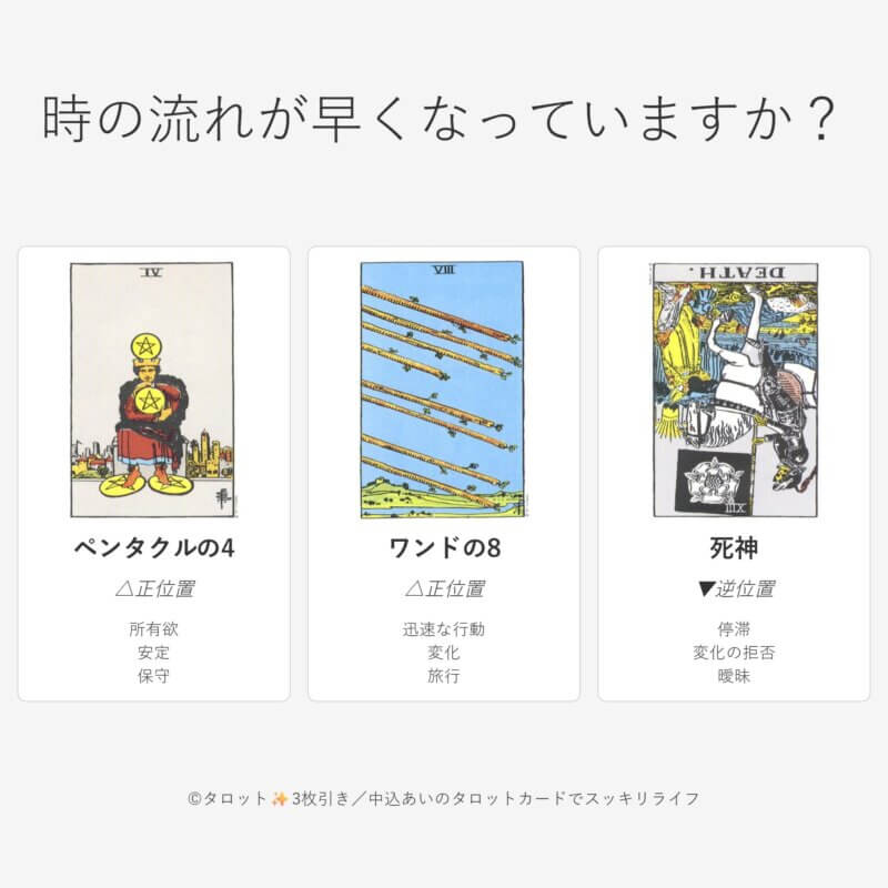 ワンドの8が出ていて、いかにも時の早さを示唆しているように見えますが…