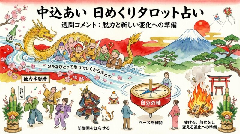 週の初めは「他力本願寺の日」として、自分を出しすぎず「お任せしましょう」というメッセージがありました。続く日も「解放日」と「防御を緩めて、隙を見せる」ことを促され、ガチガチに固めず、柔軟に受け入れる姿勢が求められましたね。